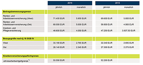 Entscheidend für die Fortschreibung der Rechengrößen in der Sozialversicherung ist die Einkommensentwicklung im Jahre 2012. Demnach sind Löhne und Gehälter in den alten Bundesländern um 2,81 Prozent und in den neuen Bundesländern um 2,42 Prozent angestiegen, so dass die Rechengrößen für 2014 turnusgemäß wie folgt angepasst wurden:  - *) Für PKV-Bestandsfälle gilt weiterhin die ermäßigte Jahresarbeitsentgeltgrenze, die von derzeit 47.250 EUR auf 48.600 EUR angehoben wird.