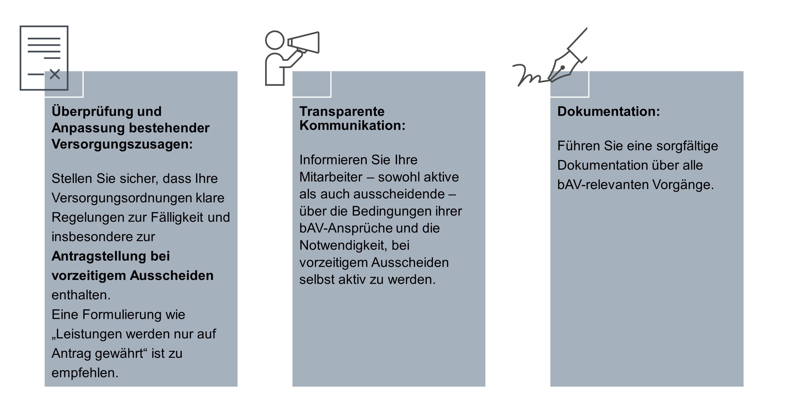 Die betriebliche Altersversorgung erfordert bei der Fälligkeit von Leistungen besondere Aufmerksamkeit. Zusammengefasst lässt sich sagen: Während der Arbeitgeber bei einem Ausscheiden rund um den vereinbarten Rentenbeginn proaktiv handeln muss, liegt die Initiative bei vorzeitigem Ausscheiden aus dem Arbeitsverhältnis in der Regel beim Versorgungsberechtigten selbst. Der Arbeitgeber ist aufgrund des damit verbundenen, unverhältnismäßig hohen Aufwands nicht verpflichtet, lange ausgeschiedene Mitarbeiter aktiv aufzuspüren.